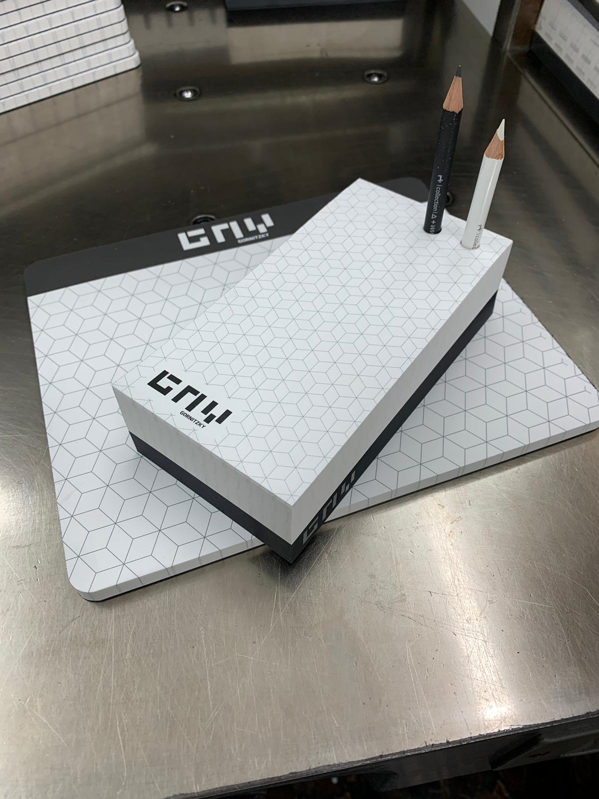 הבלוק מונח על קרטון אפור קשיח לכתיבה נוחה בכל מקום